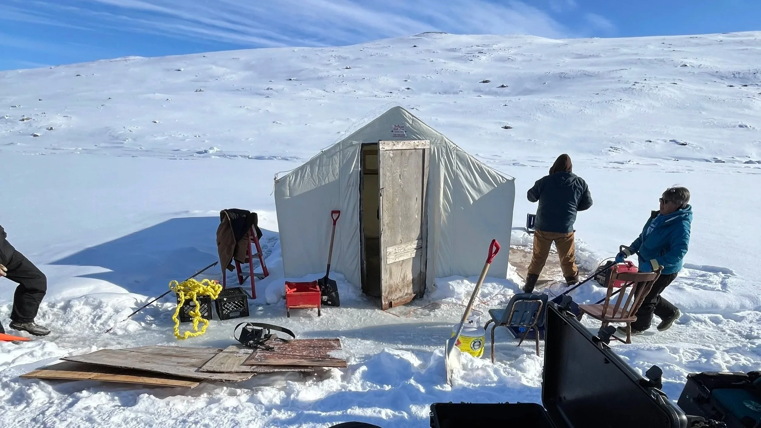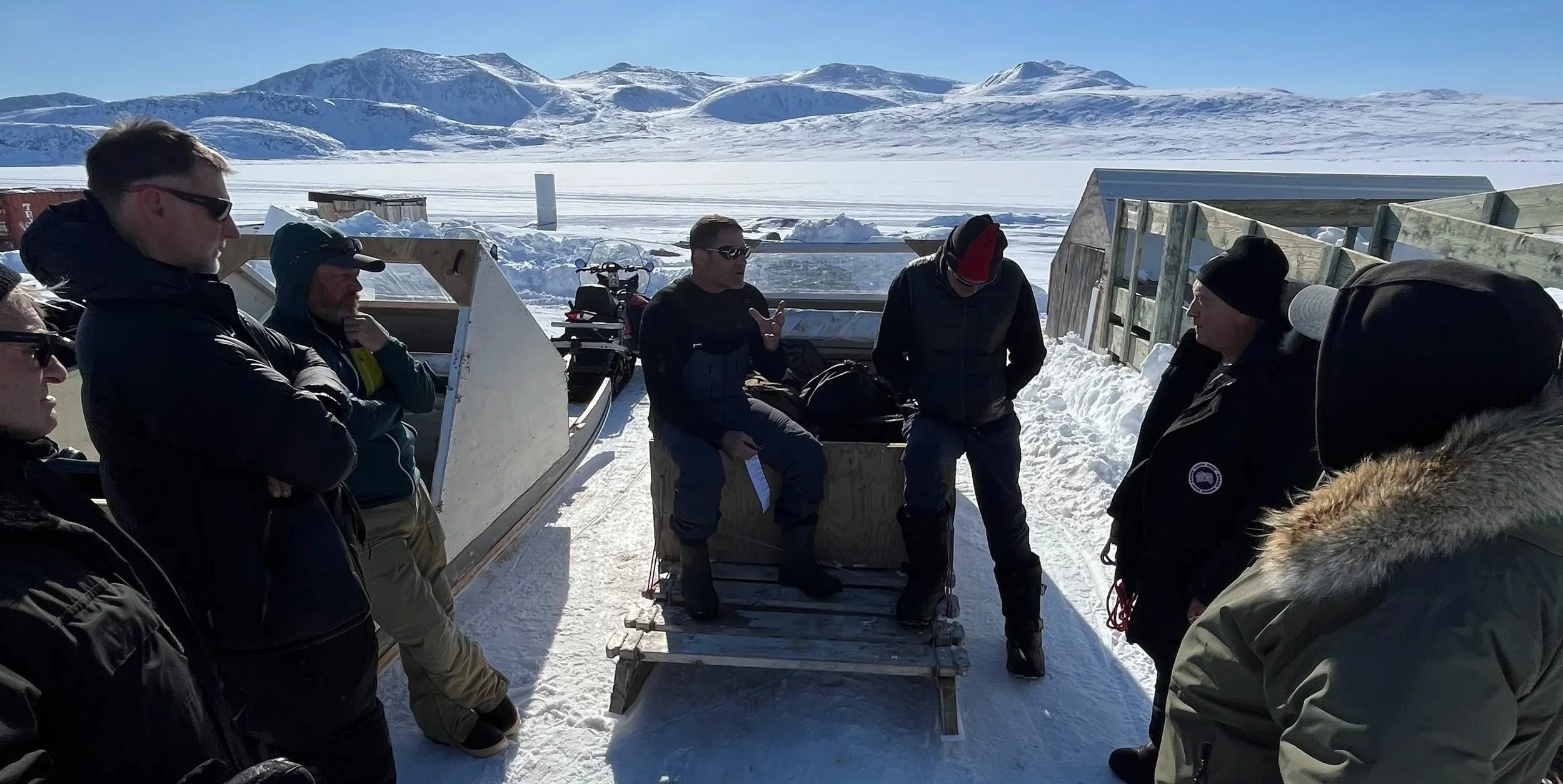 Typically when preparing for an ice dive, you want to ensure your camera kit and dive kit is squared away with a checklist and plenty of time to ensure double checks and triple checks for leaks, missing kit and more. In this situation Steve was slated to move on for another leg of the production in 48 hours, we had no choice but to jump in full speed. This was by far the fastest kit setup I’ve experienced on a project. It was also one of the first times I have ever had to build my kit from scratch due to baggage restrictions. The support team from Arctic Kingdom Expeditions rallied the sleds, snowmobiles and crew to head out from the hotel directly across the ice. Our full crew included UK producers, sound technicians, camera operators, dive specialists and the local Inuit guide Sammy Qappik.