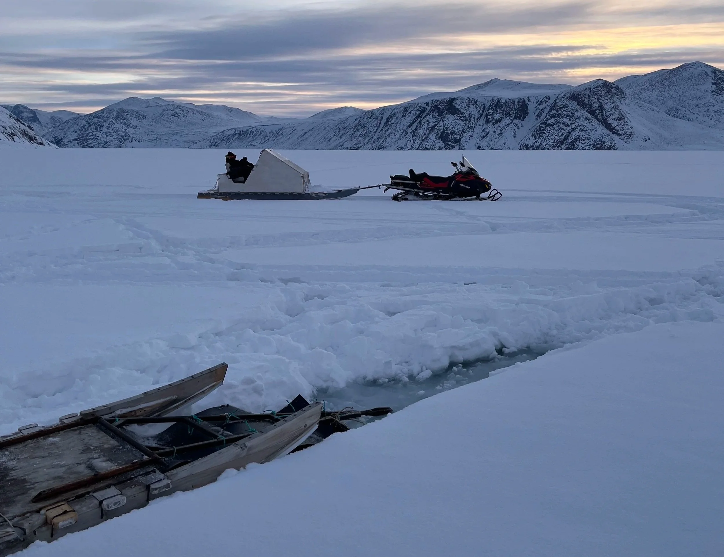 As Steve disappeared through the hole we waited for the signal that the topside film crew had finished filming Steve’s dive debrief and the remaining crew were clear to ascend and exit. This static wait quickly became excruciating with 5 finger gloves as I simply hovered, neutrally buoyant, becoming colder by the second. Many ice divers choose the lobster claw gloves to keep their hands warmer but I need maximum dexterity for button control on my underwater housing, which trades off as being incredibly cold once your body temperature drops near the end of an hour long dive beneath the ice. Thankfully we all surfaced safely through the hole in time for everyone to warm up and pack up for our long, dark journey back to the hotel. As if to remind us of why we were there to tell a story of the changing climate, we encountered ice melts that attempted to devour our snowmobile's and sleds. Thankfully with some team effort, we were eventually able to pull them loose and finish our journey home for some rest.